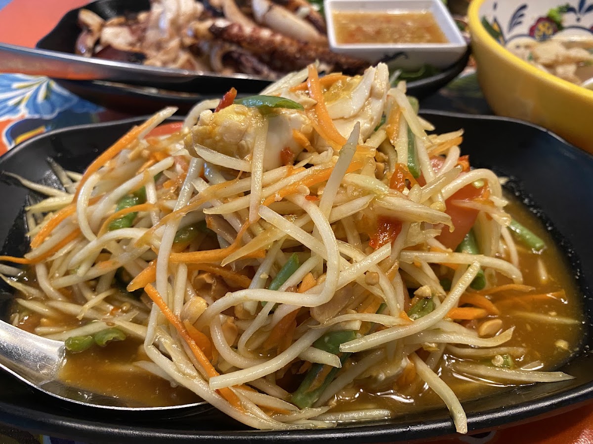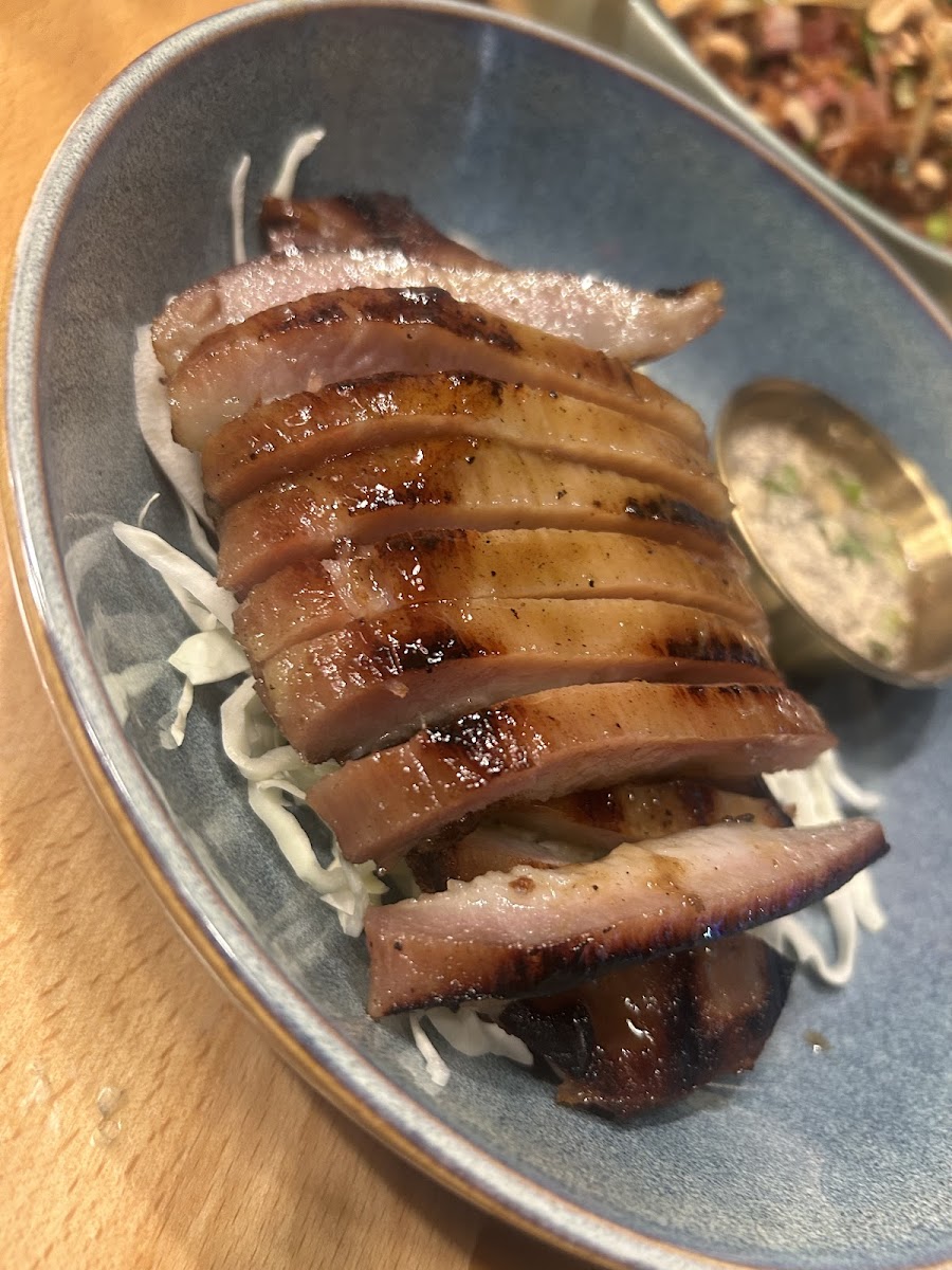 The menu leans heavily into Isan-style Thai cooking, which is known for bold seasoning, fermented notes, and a balance of spicy, sour, and savory flavors. Instead of toning things down, the kitchen sticks close to tradition. A server once explained how their som tum uses fermented fish sauce the same way it’s done in rural Thailand, and you can taste the difference immediately. The papaya stays crisp, the chili heat builds slowly, and the lime keeps everything bright. Dishes like larb and grilled pork neck come out with that unmistakable smoky aroma, proof that real technique is at work rather than shortcuts.